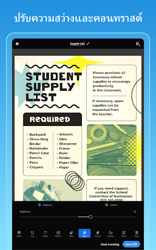 3. การจัดเก็บและจัดการเอกสาร: Adobe Scan สามารถบันทึกเอกสารสแกนในรูปแบบ PDF และเชื่อมต่อกับ Adobe Document Cloud เพื่อการเข้าถึงและจัดการเอกสารได้จากทุกที่.